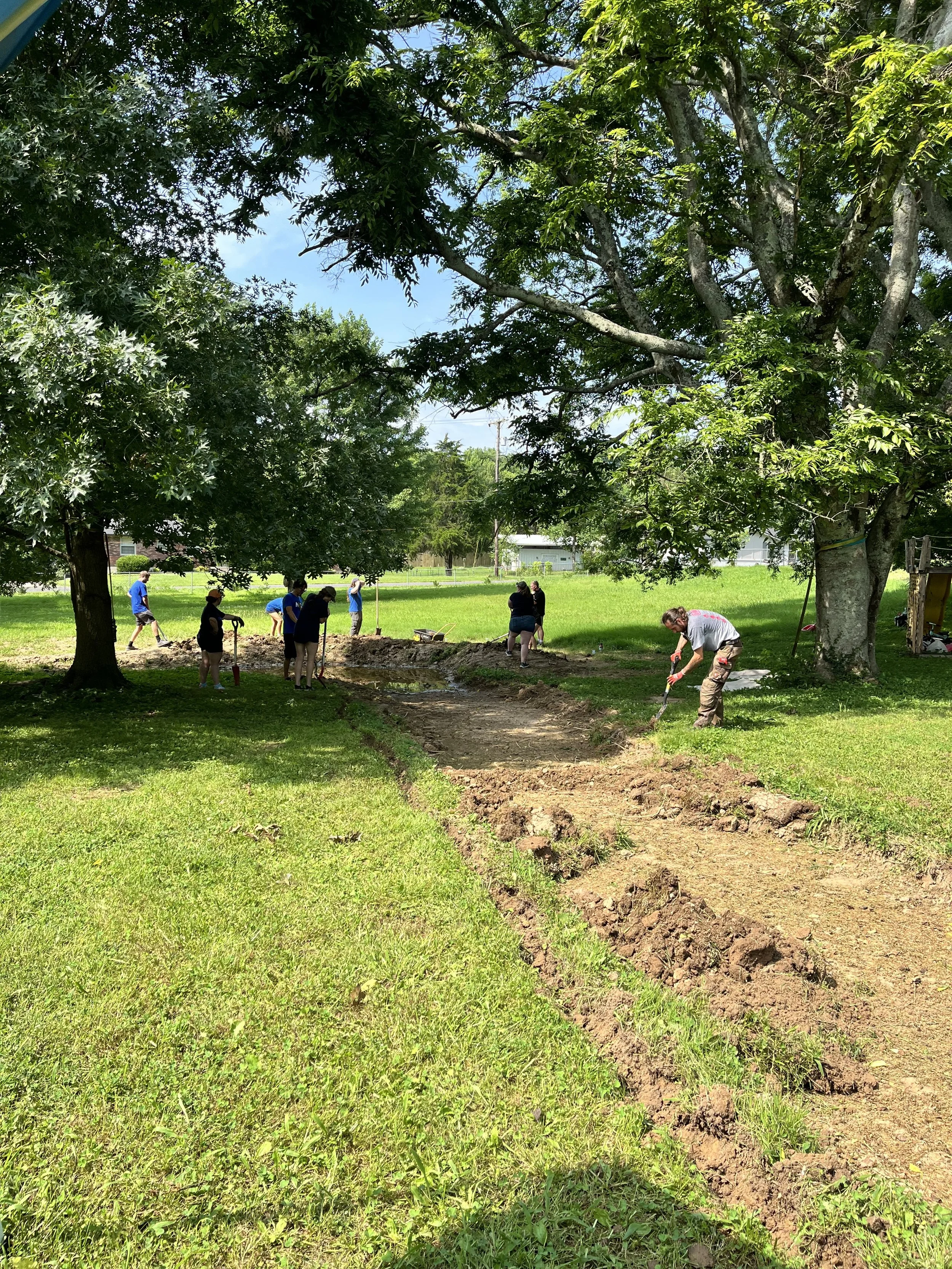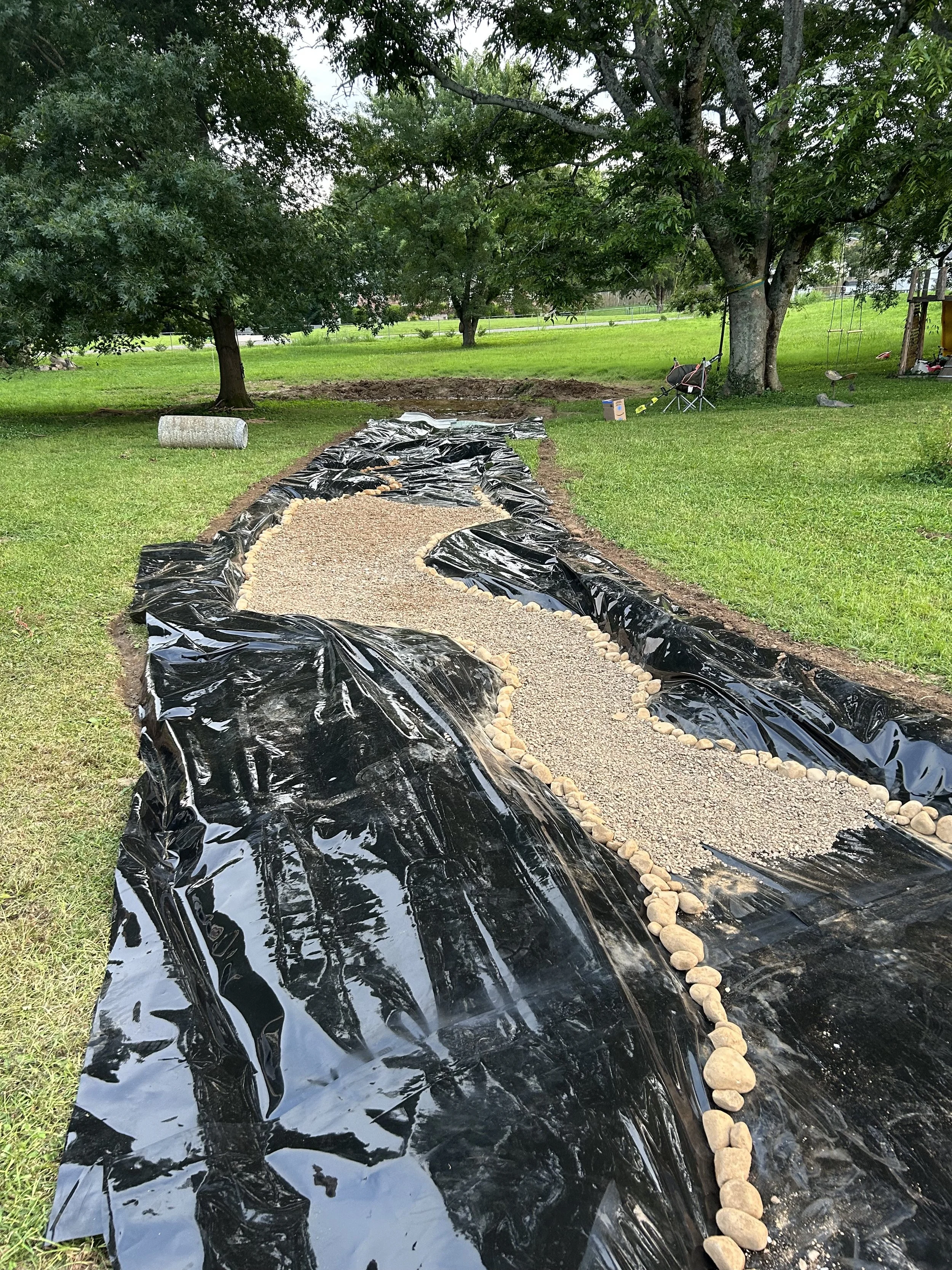 NIQ showed up with heart and hands, helping turn our creek vision into reality. Their team dug trenches along the creek bed, shaped the creek bed, laid down protective padding, and placed the liner that will soon hold endless childhood adventures.